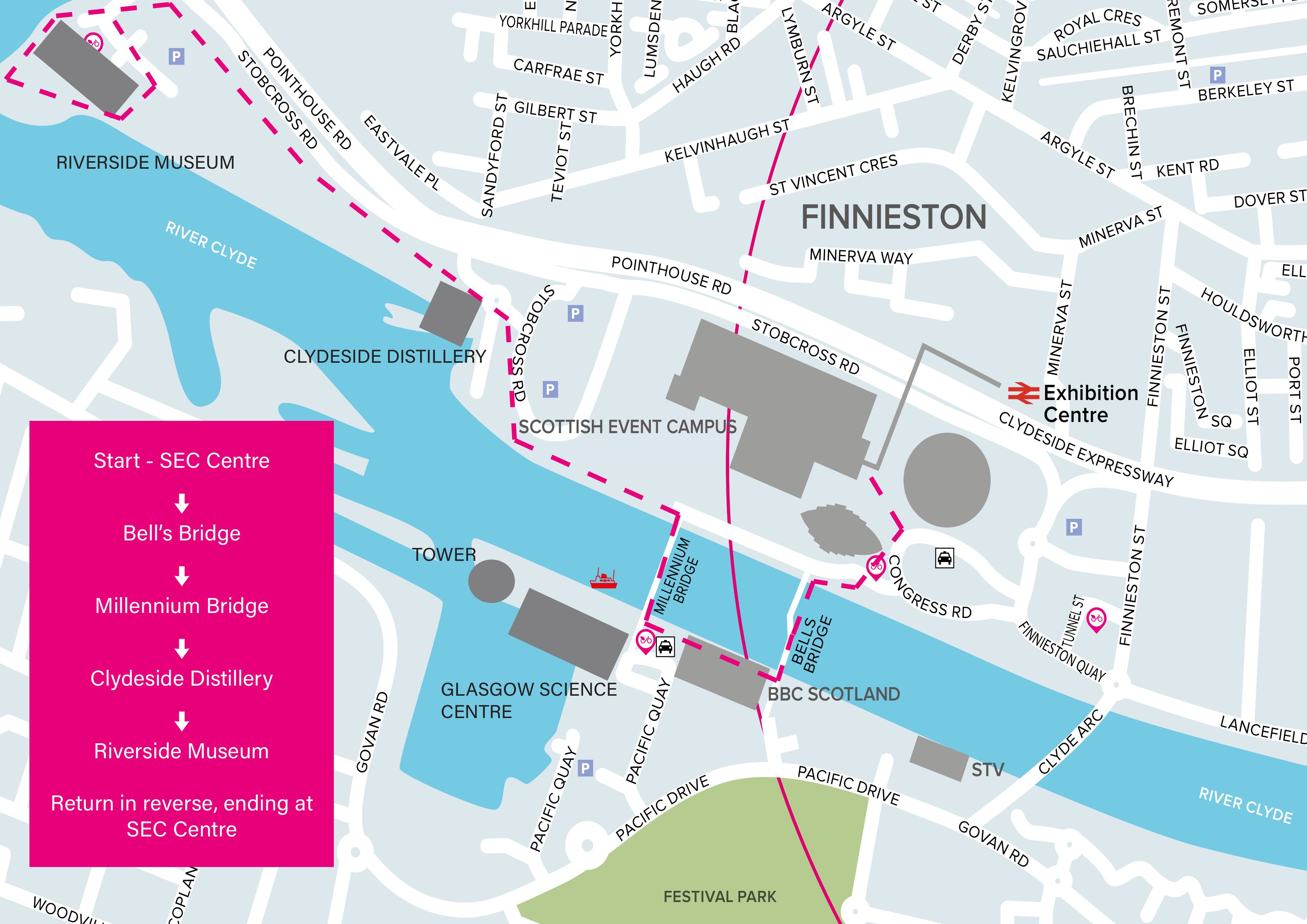 The 5k route will follow the Clyde Walkway, which runs past the SEC, and the pedestrian bridges which traverse the River Clyde near the SEC.